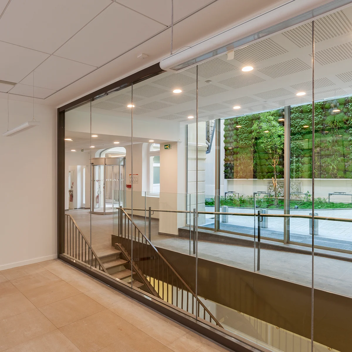Les prises de vue documentent les éléments caractéristiques du bâtiment — vitrail dans la cage d’escalier, pièce en rotonde, volumes et détails architecturaux — tout en mettant en évidence le contraste entre l’architecture d’origine et les interventions contemporaines.