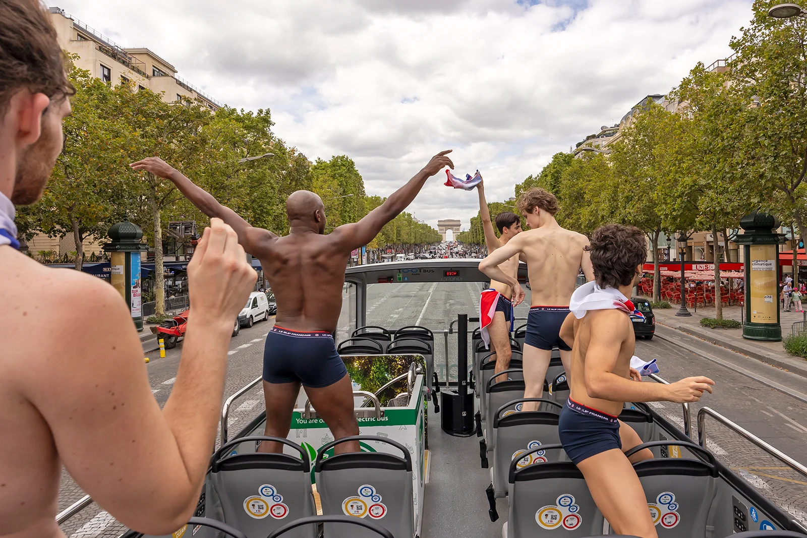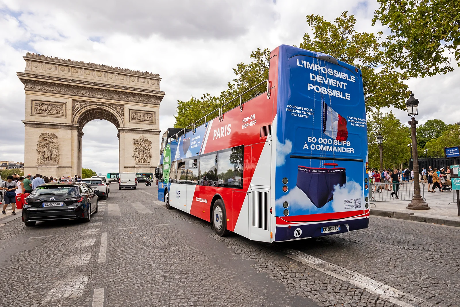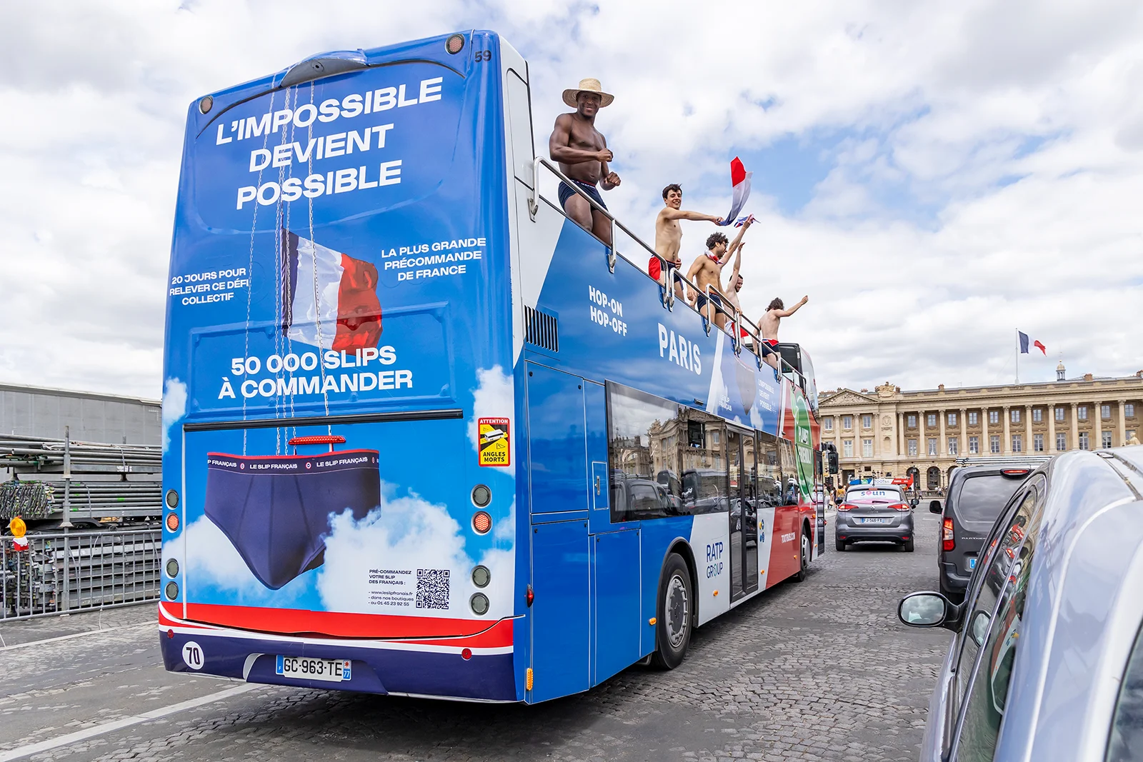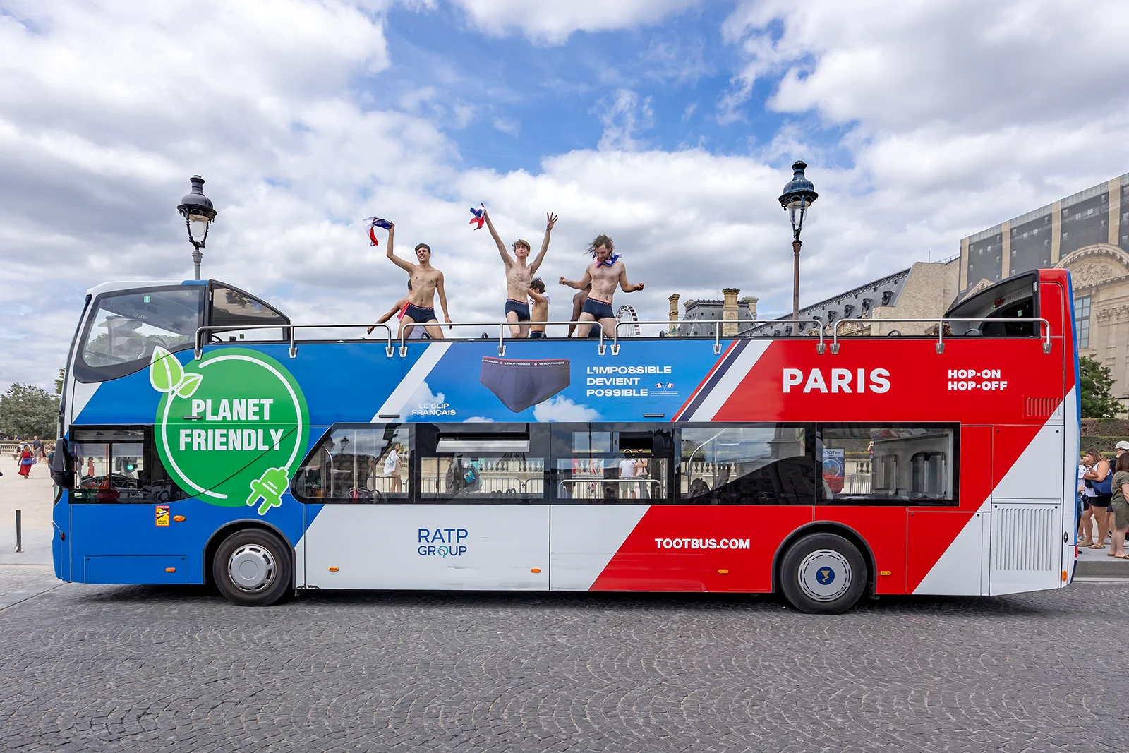 Un Tootbus aux couleurs de la marque a parcouru les rues de la capitale avec des danseurs en slip et musique à plein volume. De la place Vendôme puis du Louvre à la Concorde, des Champs-Élysées jusqu’à la tour Eiffel, ce happening festif s’est conclu place des Victoires, berceau historique de la marque.