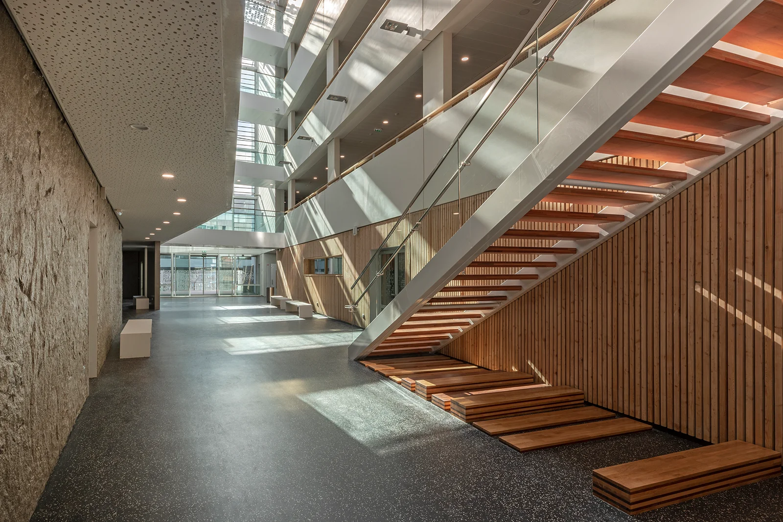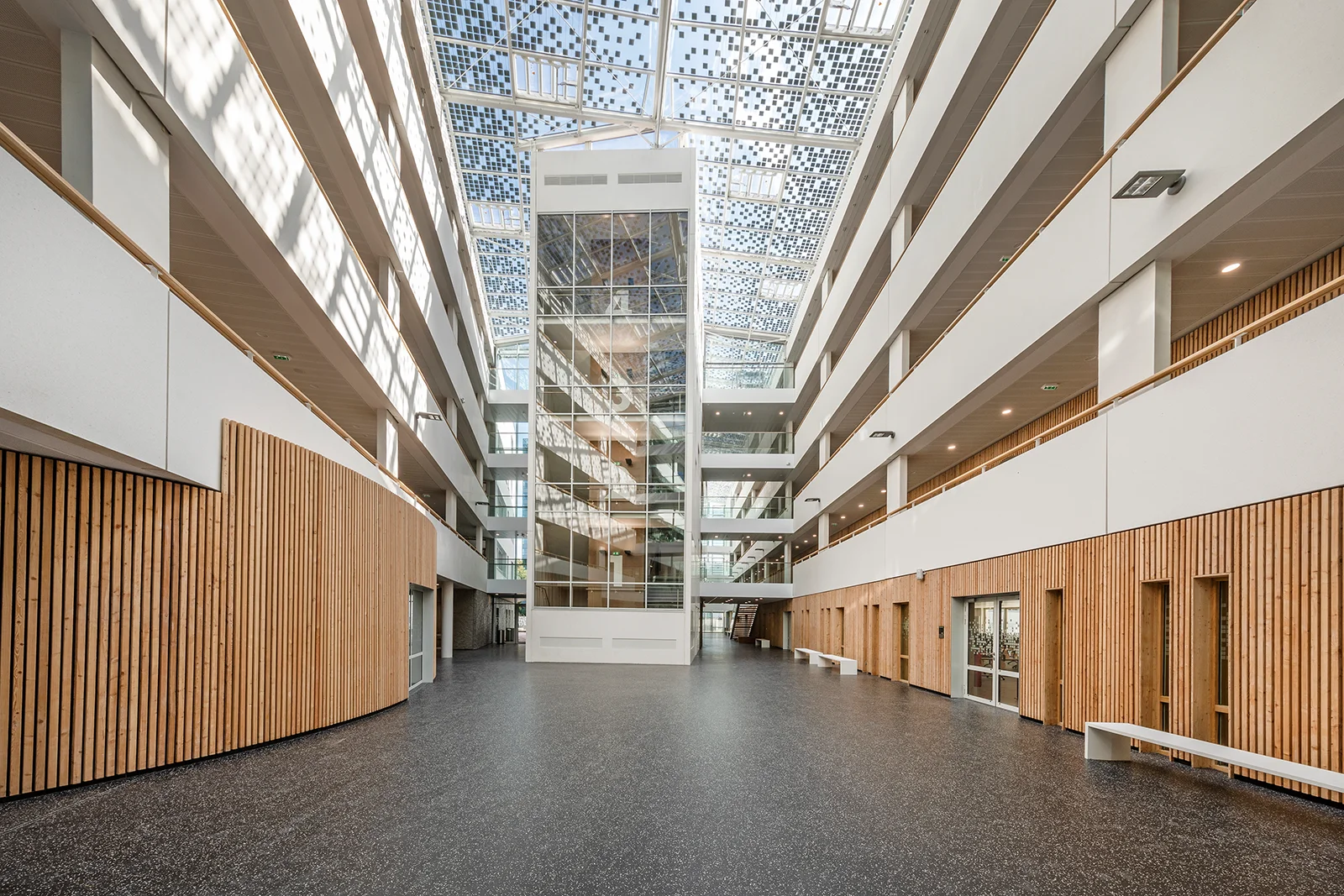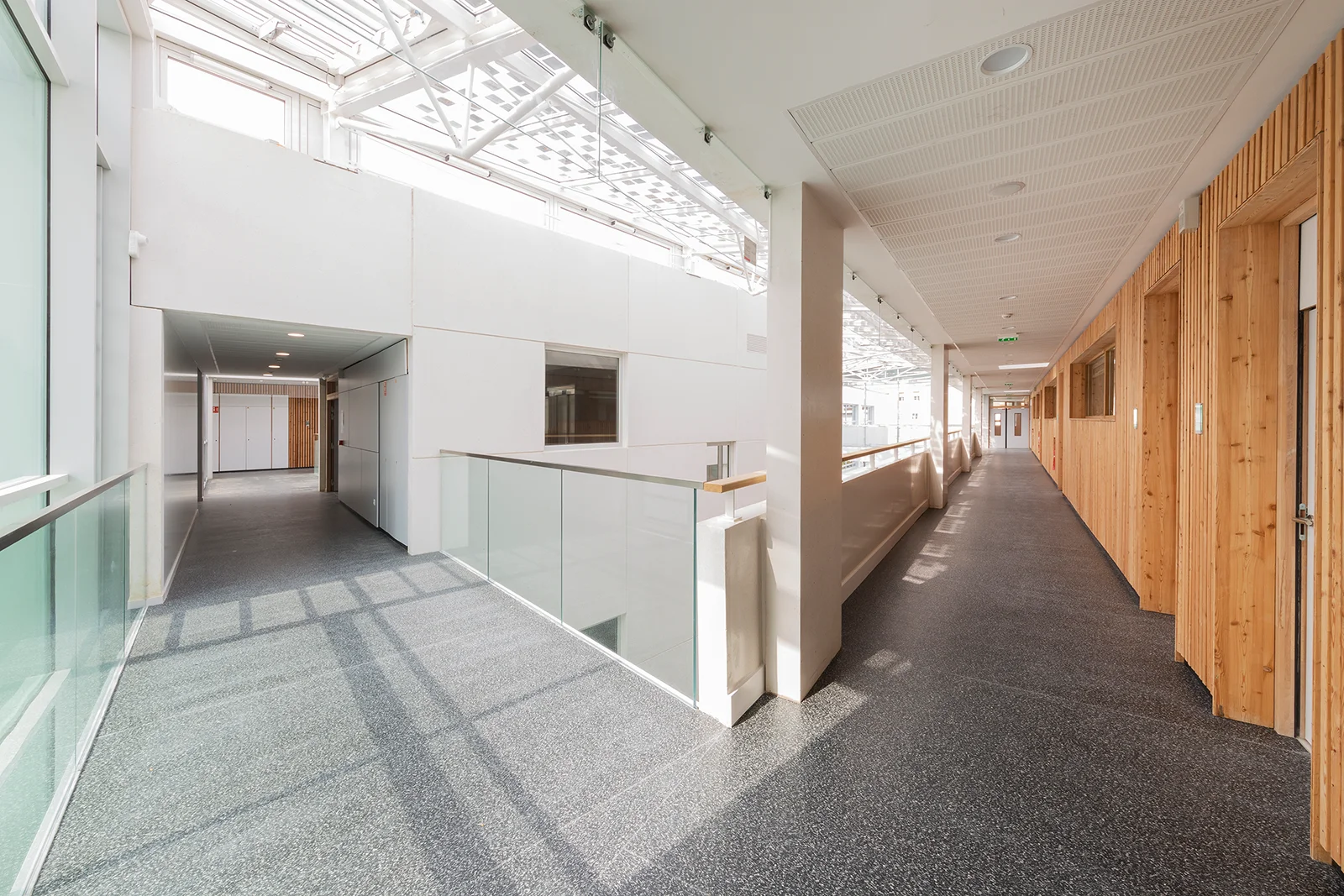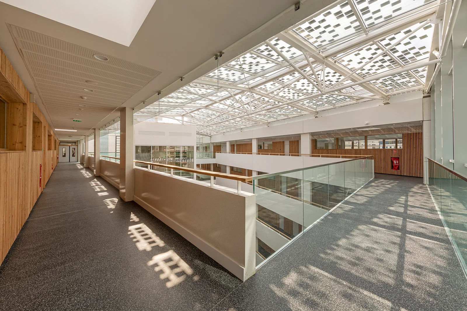 Inspiré des passages parisiens, l’établissement accueille les élèves dans un vaste atrium animé par un jeu d’escaliers et de passerelles, ainsi que par l’utilisation de matériaux chaleureux comme le bois. Mes photographies visent à mettre en lumière les volumes, les circulations et la transparence de cette architecture à l’issue du chantier.