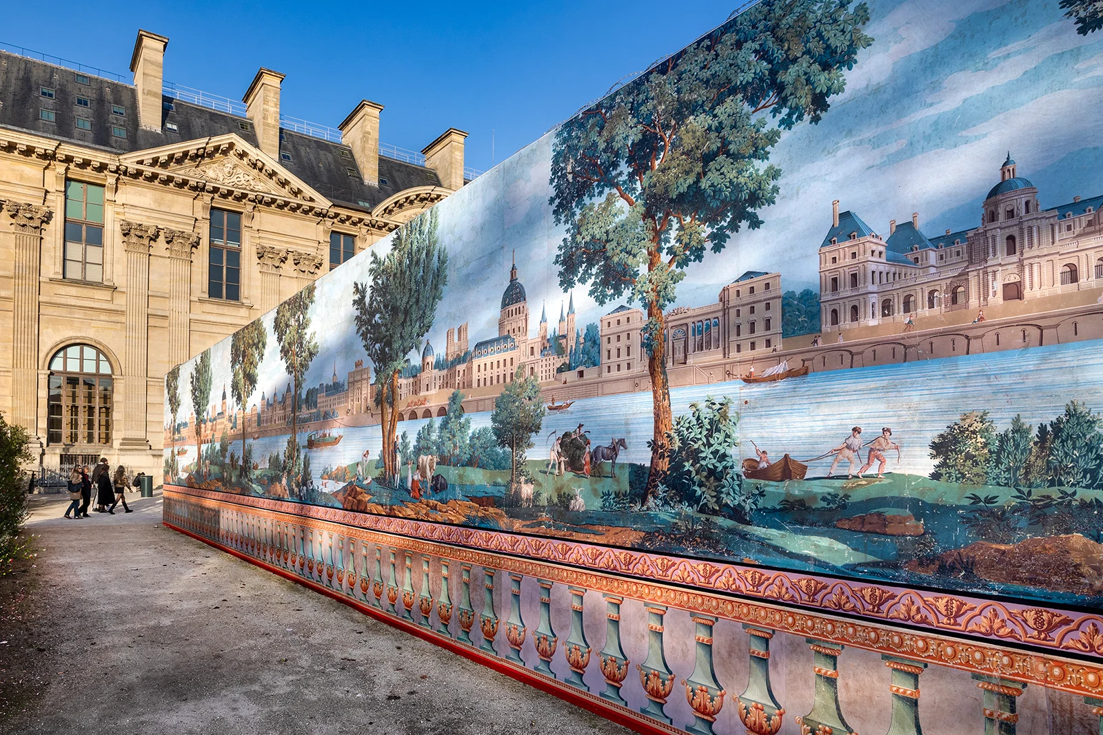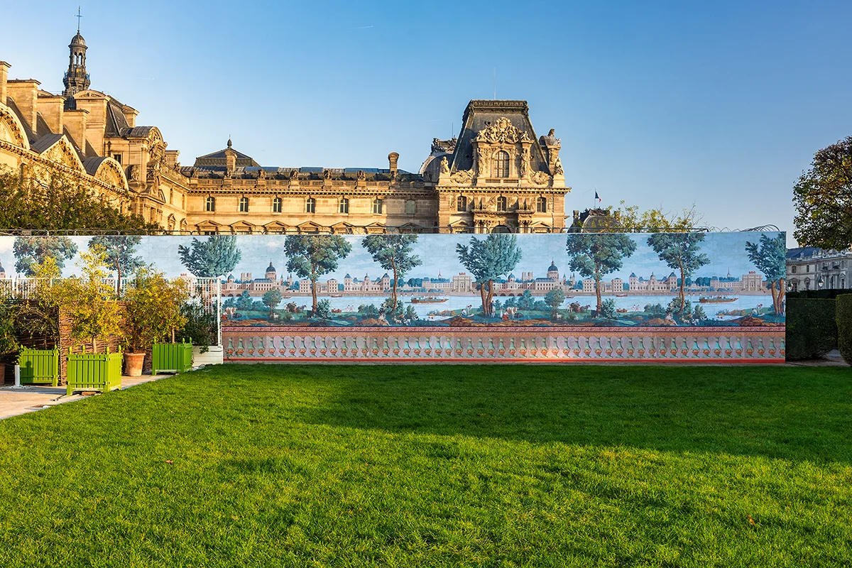 Dans les jardins du Louvre, une palissade monumentale a été installée en 2024 par Metropole : une vue historique du Louvre depuis la Seine, inspirée de peintures du XVIIIᵉ siècle, ornée d’arbres et de perspectives végétales.